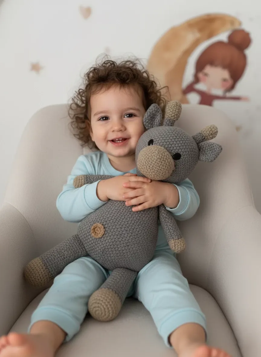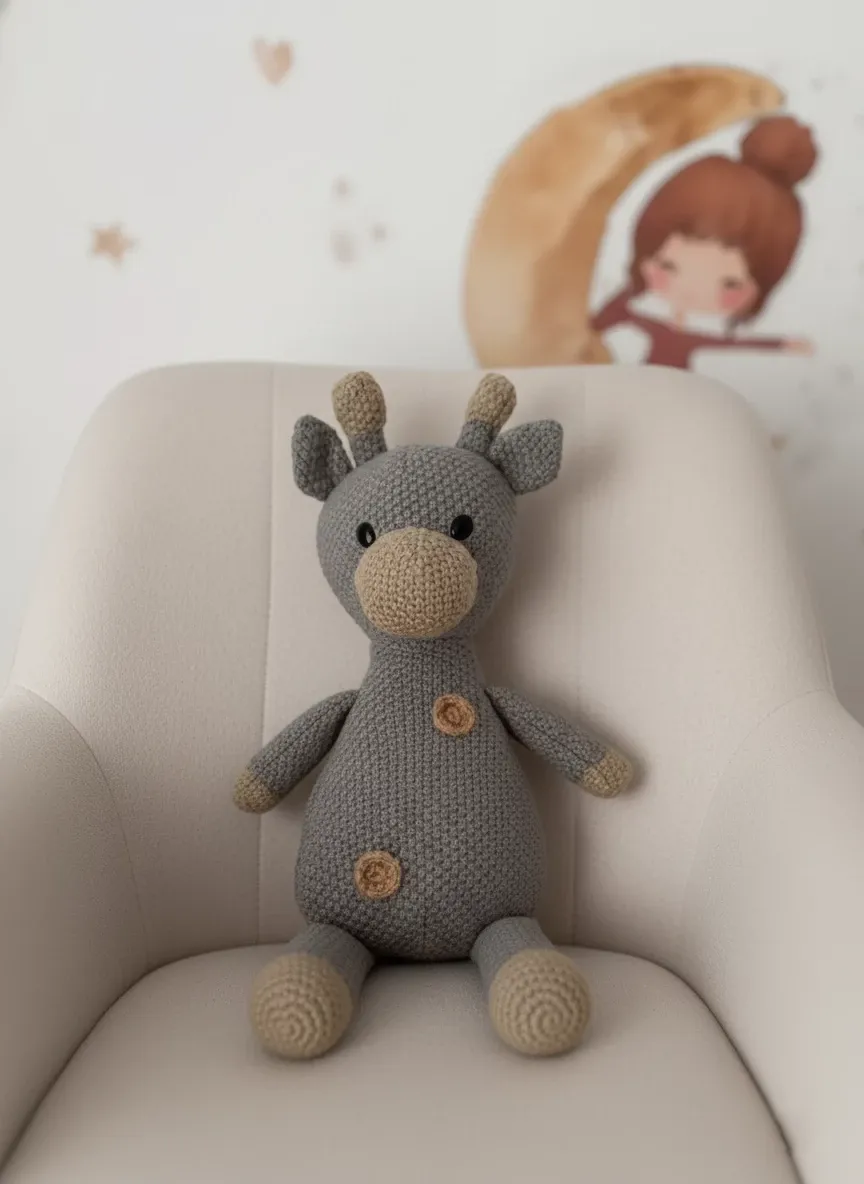 Wyjątkowa, ręcznie szydełkowana przytulanka w kształcie jelonka, idealna dla niemowląt i małych dzieci. Wykonana z miękkiej, bezpiecznej dla skóry dziecka włóczki, zapewniając komfort i bezpieczeństwo podczas zabawy i snu.