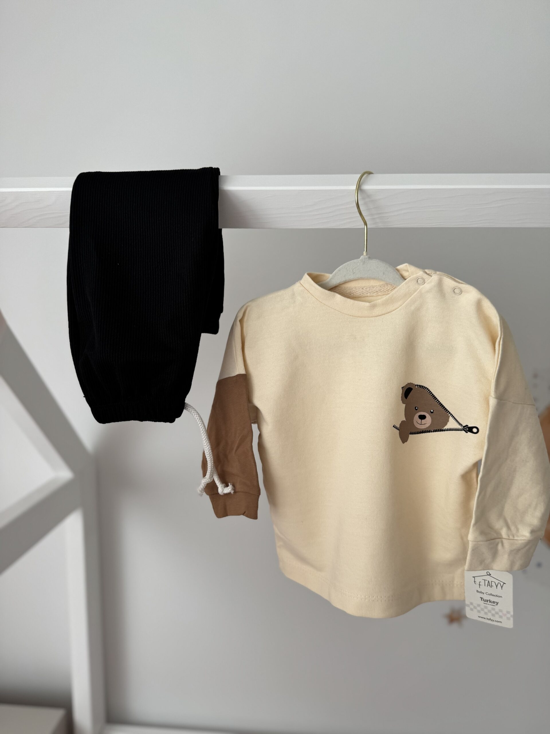 Delikatna bluza z bawełny 100% zapewnia pełen komfort noszenia, jest miękka, oddychająca i przyjemna dla skóry. Na przodzie znajduje się słodki nadruk misia, który dodaje całości wyjątkowego uroku. Zapięcia na ramieniu ułatwiają ubieranie.
