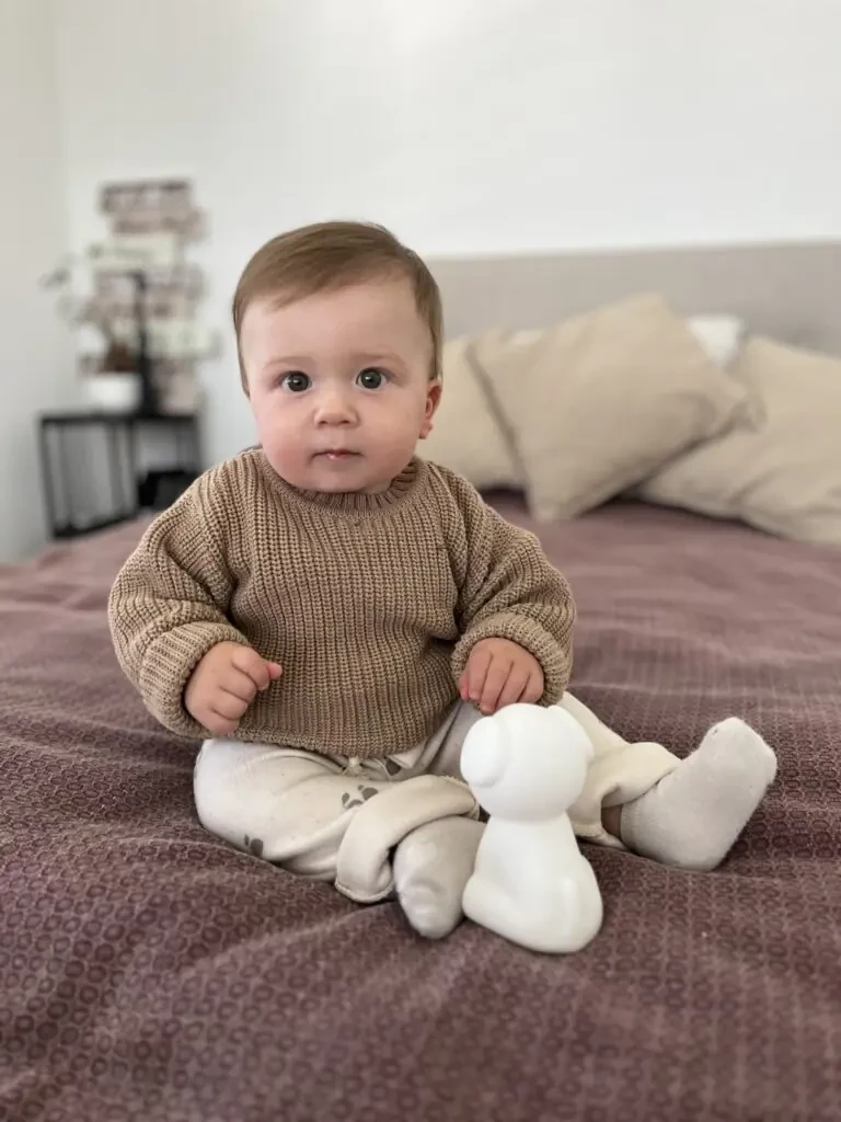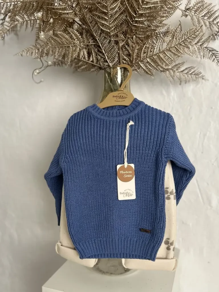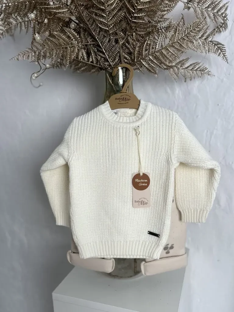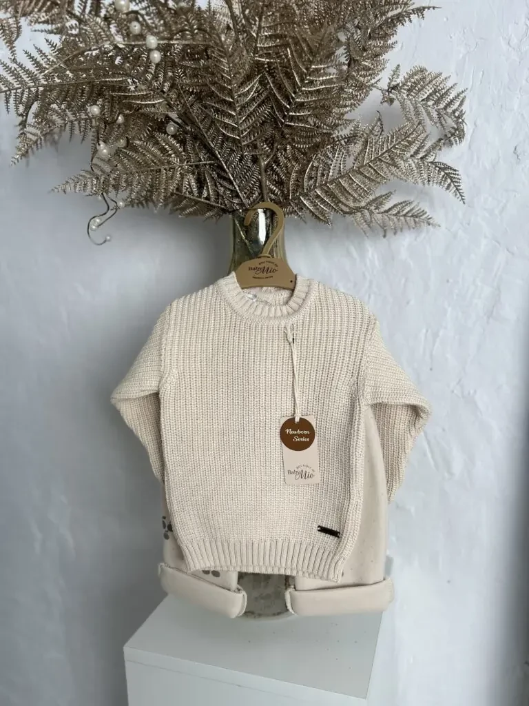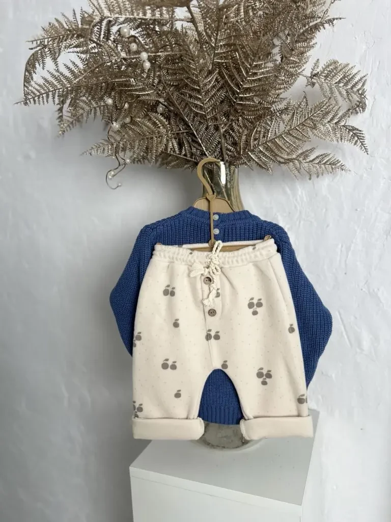 Sweterek posiada klasyczny fason z subtelnymi detalami, które nadają mu elegancki charakter. Spodnie zapewniają komfort podczas leżenia, raczkowania i pierwszych kroków.